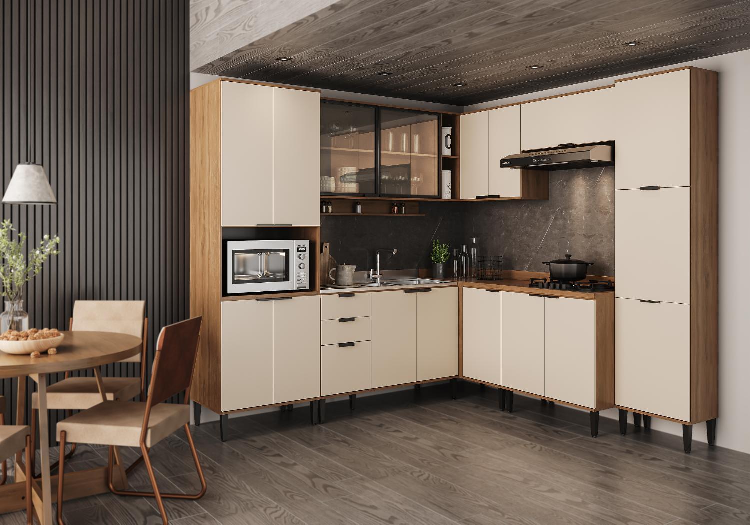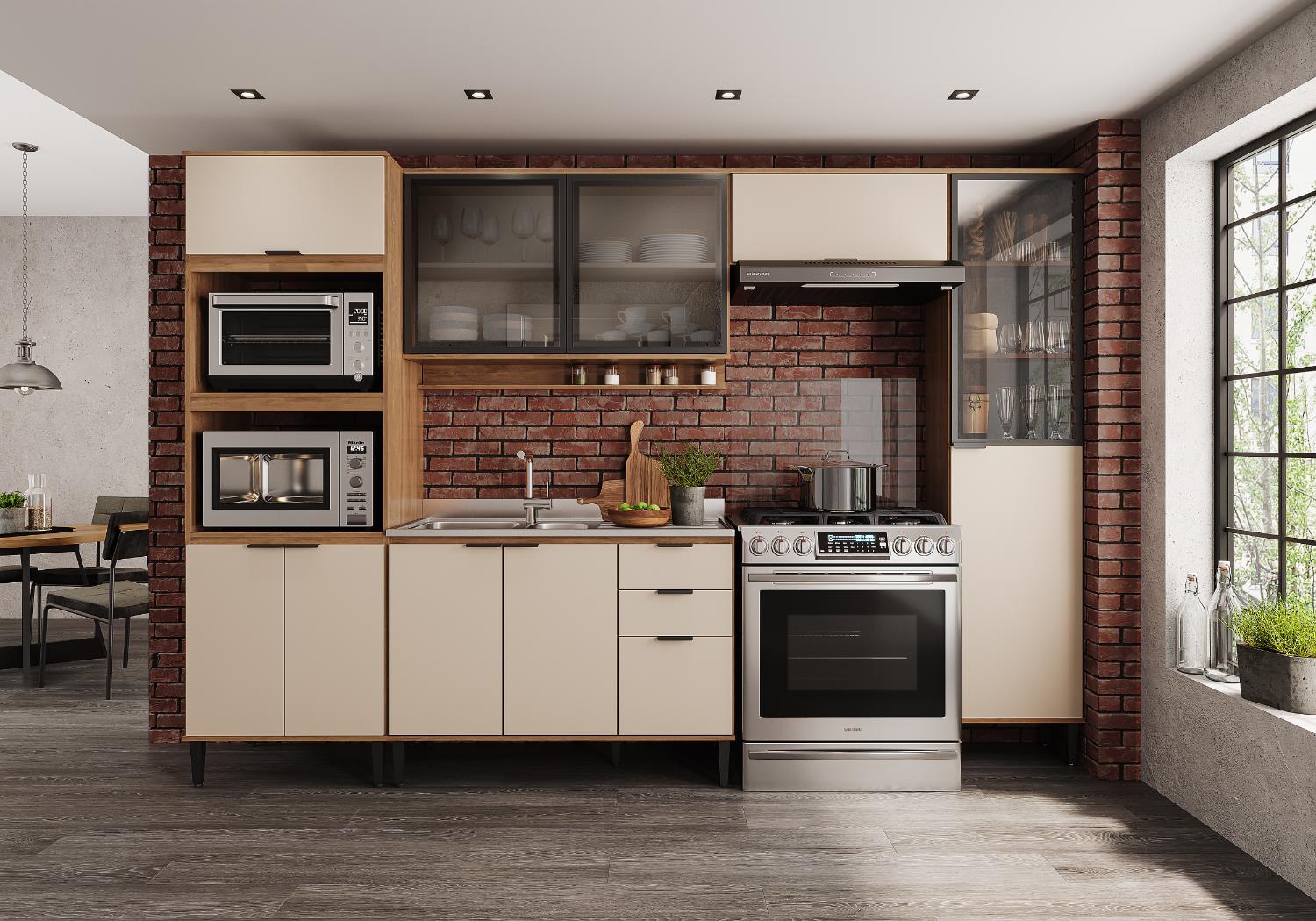 A Cozinha Alpha é a fusão perfeita de estilo e funcionalidade. Inspirada no industrial nova-iorquino, combina MDP e vidro canelado, criando um ambiente único e cheio de personalidade. Puxadores resistentes e dobradiças metálicas garantem durabilidade. A Cozinha Alpha traduz funcionalidade, organização e estilo no coração da sua casa. Transforme sua área gourmet e eleve o nível da sua cozinha!